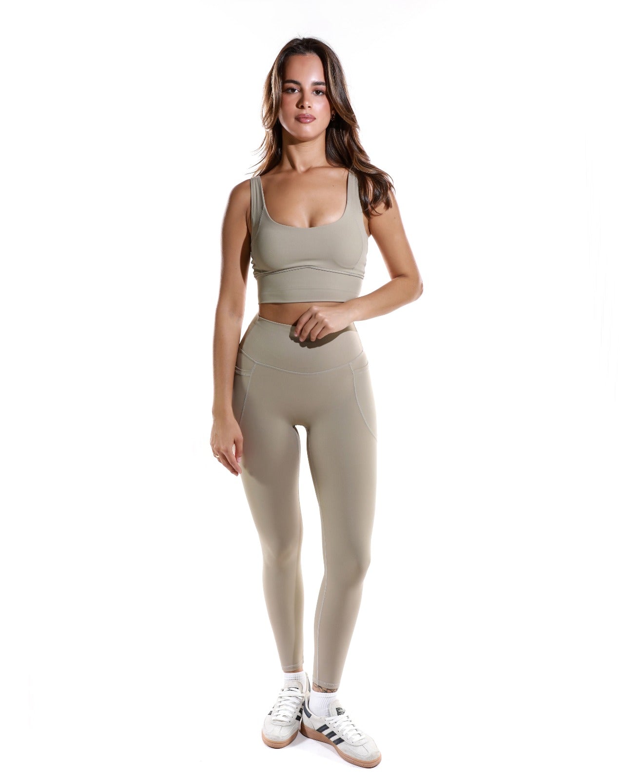 High-waisted yoga set with elegant threaded details and a design that highlights a beautiful back, perfect for running and everyday workouts.